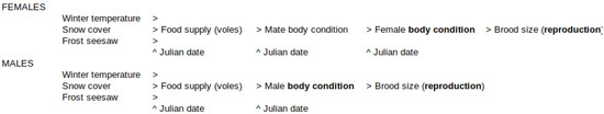 Path diagrams of the relationships of some extrinsic factors affecting body condition and reproduction in female and male Tawny Owls Strix aluco in southern Finland (see Section 2.3). The symbols > and ^ indicate the direction of the effect.