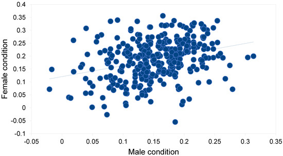 Relationship between the male body condition and female body condition of breeding pairs of Tawny Owls Strix aluco in the studied population in southern Finland (f(x) = 0.428x + 0.121, r = 0.316, df = 330, p < 0.001).