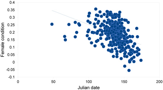 Relationship between Julian date and female body condition of breeding Tawny Owls Strix aluco in the studied population in southern Finland (f(x) = −0.002x + 0.434, r = −0.424, df = 330, p < 0.001).