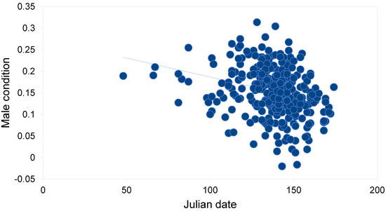 Relationship between Julian date and male body condition of breeding Tawny Owls Strix aluco in the studied population in southern Finland (f(x) = −0.001x + 0.275, r = −0.275, df = 330, p < 0.001).