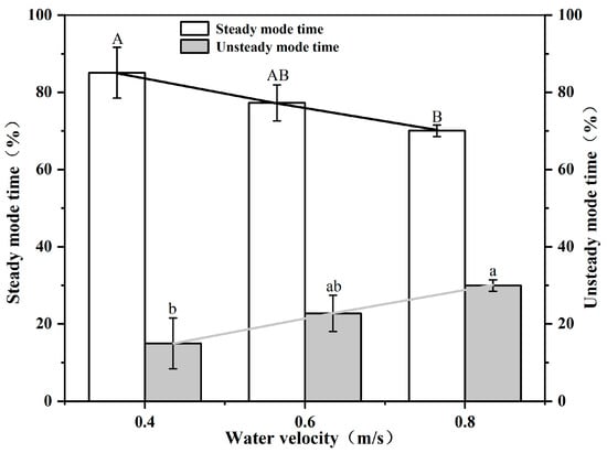 Correlation between steady/unsteady mode time and water flow velocity for S. malacanthus. Different upper cases indicate the significant the difference of water velocity in steady mode time treatments; Different lower cases indicate the significant the difference of water velocity in unsteady mode time treatments.