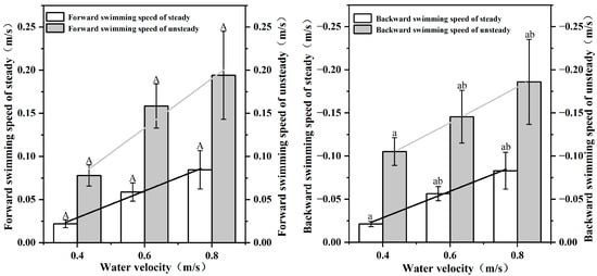 Relationship between forward/backward velocity and water flow velocity in steady/unsteady mode of S. malacanthus swimming. Different upper cases indicate the significant the difference of water velocity in forward swimming speed of steady/unsteady treatments; Different lower cases indicate the significant the difference of water velocity in backward swimming speed of steady/unsteady treatments.