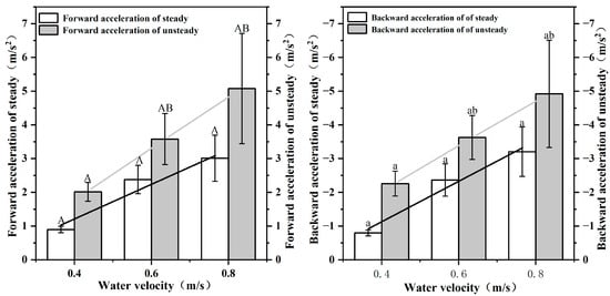 Relationship between forward/backward acceleration and water flow velocity in steady/unsteady mode of S. malacanthus swimming. Different upper cases indicate the significant the difference of water velocity in forward acceleration of steady/unsteady treatments; Different lower cases indicate the significant the difference of water velocity in backward acceleration of steady/unsteady treatments.