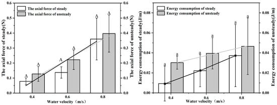 As shown in Figure 6, the energy consumed by fish in the unsteady mode ranged from 0.030~0.047 (0.039 0.016) J/m, which was significantly higher than that consumed in the steady mode and was 1.27~3.33-times higher than that consumed in the steady mode (p < 0.05). The range of energy consumption in the steady mode was 0.009~0.037 (0.023 0.016) J/m.