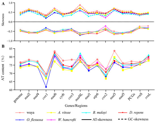 AT/GC contents and AT/GC skews of the investigated mitogenomes. (A) AT GC skews. (B) AT contents (%).