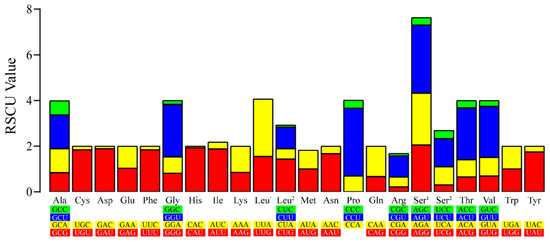 The PCGs in the mt genome of Neofoleyellides sp. contained 3479 amino acids, including 176 strongly basic (+) amino acids (K, R), 156 strongly acidic (-) amino acids (D, E), 1852 hydrophobic amino acids (A, I, L, F, W, V), and 800 polar amino acids (N, C, Q, S, T, Y). RSCU analysis showed that nearly all codons were used in the mt genome, except for CCG (Pro). CCU (Pro) was the most common codon in the Neofoleyellides sp. mt genome with an RSCU value of 2.52, followed by UUA (Leu1) with an RSCU value of 2.23. Except for CCG (Pro), CAC (His) was the least common codon in the mt genome with an RSCU value of 0.07 (Figure 3). Synonymous codon usage bias may be attributed to various factors including gene function, recombination, mutation bias, GC composition, gene length, codon position, environmental stress, and population size [34]. Codons ending with A or U were more common than those ending with CG or GC, which is a common feature of some species [35].