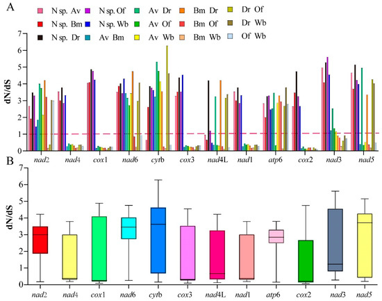 Ratio of the rates of non-synonymous (dN) to synonymous (dS) nucleotide substitutions (dN/dS). (A) Bar graph of the pairwise ratios of dN/dS for each of the mitochondrial subunits of the investigated species. (B) Box chart illustrating the average pairwise ratios of dN/dS for each of the mitochondrial subunits of the investigated species. The dN/dS ratios are plotted on the y-axis, and the PCGs are plotted on the x-axis.