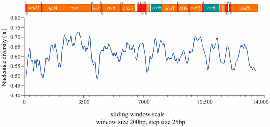 To investigate the evolutionary pressure acting on different regions of the protein-coding mt genome, the corresponding sequences of each PCG in the studied species were paired based on the non-synonymous and synonymous substitution (dN/dS) ratio. The results indicated that different regions have evolved globally under the effect of negative (or purifying) pressure. The order of influence of evolutionary pressure according to the averages obtained was as follows: cox2 < cox1 < nad1 < cox3 < nad4 < nad4L < nad3 < atp6 < nad2 < nad6 < cytb < nad5 (Figure 4). The dN/dS ratio is a measure of the selective pressures acting on genes, indicating neutral selection (dN/dS = 1), negative or purifying selection (dN/dS < 1), and positive or diversifying selection (dN/dS > 1) [36,37]. Previous studies have reported that the dN/dS ratios of four protein-coding genes (nad2, nad3, nad5, and nad6) are > 1, suggesting that these genes have evolved under positive or diversifying selection [26]. However, the dN/dS ratio range in our study was large because of the lack of complete mitogenome data for the Neofoleyellides genus. In addition to dN/dS analysis, nucleotide diversity was compared between the mt sequences obtained in the present study and those of other members of the Onchocercidae family. Nucleotide diversity was calculated for a 200 bp window, plotted against the midpoint of this window, and moved in 25 bp steps across the alignment. The values of nucleotide diversity (π) of the evaluated sequences were in the range of 0.48–0.73 (Figure 5).