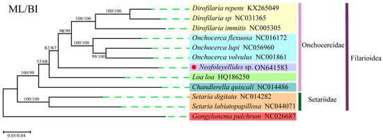 In previous studies, morphological and biological aspects were targeted for phylogenetic reconstruction; however, this method has drawbacks, especially in cases with diverse and ancient taxa [39]. Various studies have demonstrated that mtDNA sequences are valuable genetic markers for phylogenetic studies of members of Nematoda [39,40], and the advent of molecular tools has allowed a deeper investigation of the taxonomic relationships between organisms [41]. To date, only a few species have been confirmed to be infected by Neofoleyellides parasites, and more data are needed to understand their diversity and distribution, especially in wild animals [9]. However, the effect of the species of Neofoleyellides on host health has not been specifically investigated; only some pathological changes have been observed in frogs [24]. In addition, there is limited phylogenetic information on birds infected with Neofoleyellides parasites; thus, whether these parasites contribute to a risk of zoonosis is also worthy of further investigation. Therefore, mt characterization studies and the consequent inclusion of more filarial nematodes in public databases would allow more comprehensive phylogenetic reconstruction analyses and aid the elucidation of taxonomic relationships.