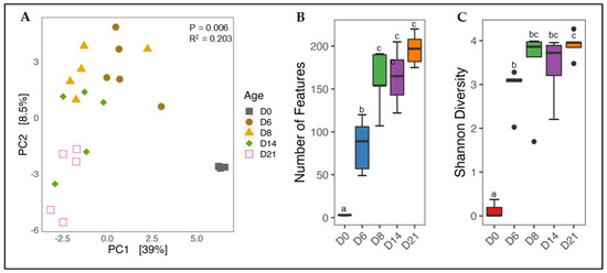 Changes in species richness and evenness with age were measured using the Observed Features (Figure 1B) and Shannon diversity (Figure 1C) calculators, respectively. Both indices increased with age, beginning with a sharp significant (p < 0.05) increase from day 0 to day 6. Interestingly, species richness further increased from day 6 to day 8 (p < 0.05) before beginning to plateau on days 14 and 21. A slight, but non-significant increase in evenness was observed between days 6 and 8 before reaching a plateau.