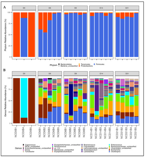 Bacterial composition was investigated by calculating the relative abundance of CSS normalized data at the phylum (Figure 2A) and genus (Figure 2B) levels. A notable switch in composition was observed at both levels. At the phylum level, the cecal microbiota at day-of-hatch was dominated by Proteobacteria in two of the three birds investigated (two samples were not sequenced due to low-quality DNA). Proteobacter was replaced by Firmicutes beginning on day 6 with the proportion of Firmicutes ranging from 55 to 99%. For days 8 through 21, Firmicutes were observed to dominate all samples representing greater than 86% of all sequences.