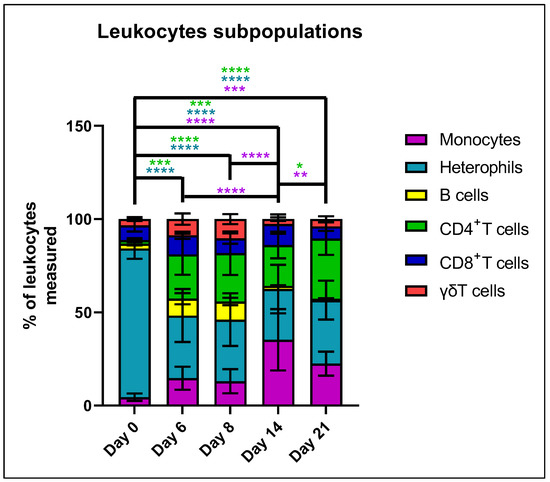 Characterization of temporal shifts in the proportions of chicken leukocyte populations. Whole blood, collected from 10 control birds at each time point, was subjected to flow cytometry to identify changes in leukocyte subpopulations. Results are shown as the percent of total leukocytes measured (CD45+CD41/61−). Significant differences were determined using Two-way ANOVA, and pairwise comparisons were completed using Tukey HSD. Results were considered significantly different at a p < 0.05. Significant difference for each cell type are indicated by asterisks color-coded to match the cell type (* = p < 0.05, ** = p < 0.01, *** = p < 0.001, **** = p < 0.0001).