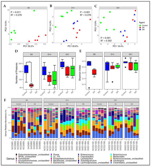 To determine the interaction between the role of the microbiota in Salmonella colonization, birds were inoculated with a three-strain mixture of ST at 7 days of age via oral gavage. Following inoculation, five birds were transferred to a pen containing naïve birds to allow for horizontal transmission. Birds receiving the oral gavage were considered to be Salmonella challenged and are referred to as the SA group. Birds colonized via horizontal transmission were considered to be naturally colonized and are referred to as the SN group. Colonization was confirmed by plating cecal contents at 21 days of age which revealed a cecal Salmonella load of 3.89 and 3.78 log CFU/mL for the SA and SN groups, respectively. For microbiota analysis, birds were euthanized, and cecal contents were collected on days 8 (24 hpi), 14 (7 dpi), and 21 (14 dpi) of life. PCA analysis revealed a clear separation in microbial composition between control and Salmonella-infected birds at all three timepoints (Figure 4A–C). The separation was observed to be statistically significant (p = 0.001) at all three timepoints with R2 values of 0.276, 0.276, and 0.262 for days 8, 14, and 21, respectively. Alpha diversity analysis revealed a significant decrease in species richness on day 8 (p < 0.05) with only approximately 80 ASVs detected in the SA group compared to approximately 160 in the control birds (Figure 4D). ASV numbers began to recover by 7 dpi with only numerical decreases in ASVs detected in the Salmonella groups on days 14 and 21. The Shannon index did not reveal any significant differences in species evenness among treatments at any time point (Figure 4F).