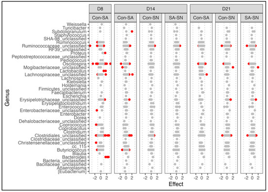 Shifts in the abundance of bacterial features in response to Salmonella colonization. At 7 days of age, control and SA birds were given an oral gavage of PBS or ST, respectively. Following inoculation, five SA birds were moved to pens with uninoculated birds (SN) to act as Salmonella seeder birds for natural horizontal transmission. Changes in the abundance of ASVs were determined using ALDEx2. Genera with features significantly affected in at least one comparison were plotted. Each dot represents the calculated effect size of a single ASV with significantly affected ASVs colored red. Differences were considered significant at FDR < 0.05 and effect > 1.