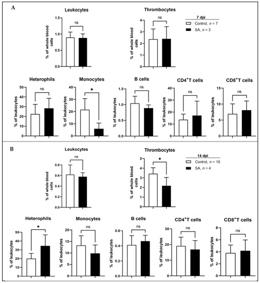 Effect of Salmonella inoculation on leukocyte populations. Whole blood, collected from 10 birds at 7 (A) and 14 (B) days post-infection, was subjected to flow cytometry to identify changes in leukocyte subpopulations. Samples displaying high amounts of clotting prior to processing were excluded. Significant differences were determined using the Student’s t-test and results were considered significantly different at p < 0.05 (ns = Not Significant, * = p < 0.05).