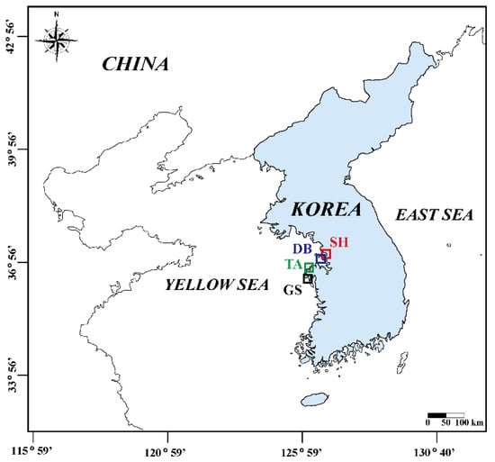 Locations of the four study areas along the west coast of Korea. Red, blue, green, and black rectangles represent SH, DB, TA, and GS tidal flats, respectively.