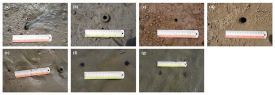 Only those showing signs of activity, such as feeding pellets, burrowing pellets, and foraging tracks of each species, were selected before sample collection to avoid including abandoned burrows. The identification of each species was determined based on the characteristics of its burrow opening and feeding or excretion trace (Figure 2, see [7] and Supplementary Materials for details).