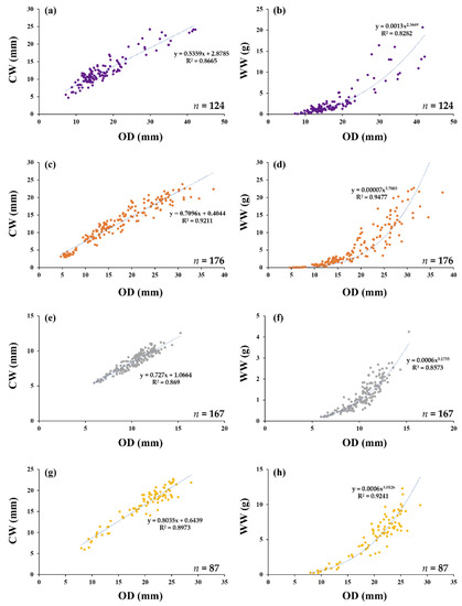The relationship between (a) OD and CW for M. japonicus, (b) OD and WW for M. japonicus, (c) OD and CW for U. arcuata, (d) OD and WW for U. arcuata, (e) OD and CW for U. lactea lactea, (f) OD and WW for U. lactea lactea, (g) OD and CW for O. stimpsoni, and (h) OD and WW for O. stimpsoni.