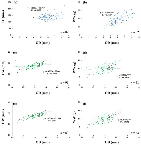 The relationship between (a) OD and TL for U. unicinctus, (b) OD and WW for U. unicinctus, (c) OD and CW for U. major, (d) OD and WW for U. major, (e) OD and CW for U. major without abnormal openings, and (f) OD and WW for U. major without abnormal openings.