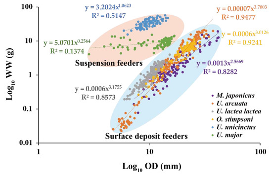 The R2 value of the OD–WW regression of the deposit feeders was higher than that of the suspension feeders (Table 3 and Figure 5). The R2 value of the OD–WW regression was highest in U. arcuata in the deposit feeders, followed by O. stimpsoni, U. lactea lactea, and M. japonicus. In the suspension feeders, U. unicinctus showed a higher R2 OD–WW regression value than U. major.