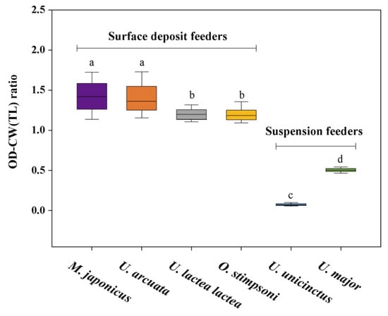 The mean OD–CW ratios of the M. japonicus, U. arcuata, U. lactea lactea, and O. stimpsoni deposit feeders were 1.42, 1.40, 1.20, and 1.20, respectively, and those of the U. unicinctus and U. major suspension feeders were 0.07 and 0.50, respectively (Figure 6). The mean OD–CW ratios of deposit feeders were significantly higher than those of suspension feeders (p < 0.05).