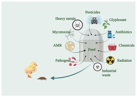 There are many more chemical feed contaminants that include residual chemicals such as antibiotics introduced via cross-contamination and lack of equipment cleaning between the batches of feed [99,100] to radiation toxicity [101] accelerated after Chernobyl and other more recent nuclear disasters, industrial waste products [102] and estrogenic polychlorinated biphenyls [103].