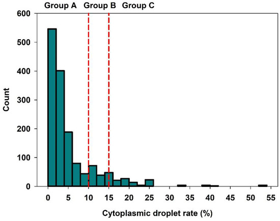 Frequency distribution of the cytoplasmic droplet rate within the study population (n = 260 ejaculates, two per boar; n = 1497 insemination records). Semen samples were assigned to three groups with different CD rates: A: low (<10%), B: medium (≥10%–<15%), and C: high (≥15%).