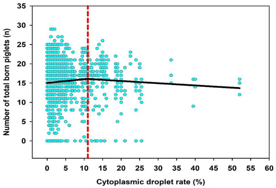 Segmental non-linear regression analysis was performed to determine potential breakpoints of the CD rate which could be predictive for the fertilizing performance of the boar. For this, data sets were divided step by step into two to five segments. Only results of the two segmental non-linear regression analyses were presented, because the division into more than two segments did not yield any further information. It could be shown that a CD rate > 11% was classified as downshifting the number of total born piglets (Figure 2). For the fertility indicator farrowing rate, no meaningful breakpoints were found in the data distribution regarding the incidence of CD in the semen samples. Group comparisons between ≤11% CD (n = 1299) and >11% CD (n = 198) did not show significant differences in litter sizes and farrowing rates (p > 0.05).
