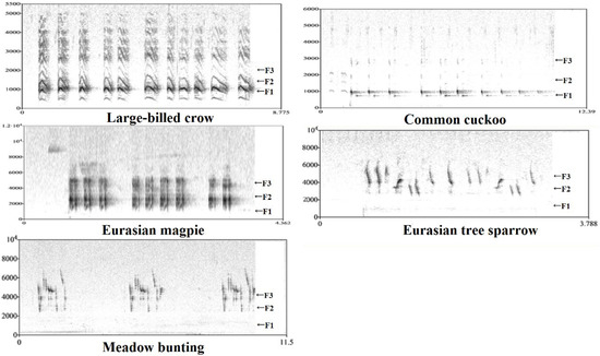 The narrow-band spectrogram of the sound of five birds extracted by PRAAT. The F1, F2 and F3 represent the first, the second and the third formant, respectively.
