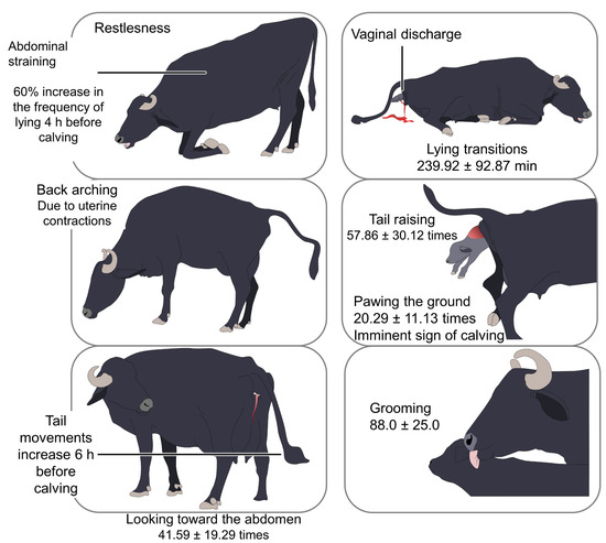 The exhibition of these changes depends on the parturition phase. As stated by Deka et al. [40], during the first phase, restlessness, reduced interest in feed and water, lying transitions, tail raising, abdominal straining, back arching, vaginal discharge, and frequent urination predominate. The animal’s habit of looking towards its flanks, pawing the ground, and reduced feed intake are also present during this stage [8,9], and are associated with the onset of pain [41].