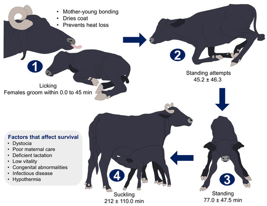 Factors affecting neonatal survival and characteristics of newborn calves during the first hours of life. The sequence of post-birth behaviors of the calf are numbered inside the figure, where the licking and grooming of the dam encourages the newborn to stand up and suckle. Under normal conditions, the offspring follows this pattern. However, factors such as dystocia, poor maternal care, and hypothermia, among others, can affect calf’s survival.