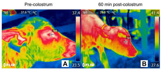 Effect of colostrum on thermoregulation in the newborn calf (Bubalus bubalis). (A) Lateral facial thermogram of a calf before receiving colostrum. The temperature assessed at the lacrimal caruncle shows an average value of 37.6 °C. In contrast (B), 60 min post-colostrum intake, the same thermal window has an average temperature of 39.0 °C. This represents a gain of 1.2 °C after feeding and rapid obtainment of available energy resources in colostrum. +Sp1: default focal point of the software. Thermal images obtained using a FLIR thermal camera.