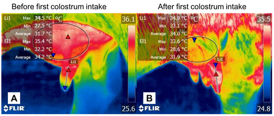 Microcirculatory changes in a water buffalo (Bubalus bubalis) udder before and after colostrum ejection. (A) Lateral region of the udder before the first colostrum intake. The average temperature of the teat (Li1) is 31.7 °C, a temperature that is lower than the average recorded in the body of the gland, at 34.2 °C. This could be due to the effect of estrogens and the congestion of the mammary gland (MG) before feeding the newborn. (B) After the first colostrum intake, a shift in the average temperatures is observed, where the teat has a 2 °C higher value, and the body of the MG has an average temperature 2.3 °C lower than the one observed in image (A). This effect can be attributed to the effect of colostrum ejection, where the calf stimulates the teat, suckles, and requires a larger supply from this zone. The maximum temperature is illustrated with a red triangle and the minimum with a blue one. Thermal images obtained using a FLIR thermal camera.