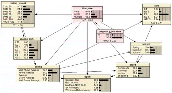 The most influential variable in determining pregnancy outcome (pregnant or non-pregnant) and fetal number (single or multiple fetus), respectively, could be investigated using a BN model with respect to the potential variables of breed, mating BCS, mating liveweight (weight), mating season (season), region, seasonal conditions during mating (during) and ram percentage (ram) (Figure 1). Mating liveweight, BCS and ram percentage categorical data was refined. By selecting different potential variables, the BN model estimated/predicted the likelihood of pregnancy outcome and fetal number (of pregnant ewes).