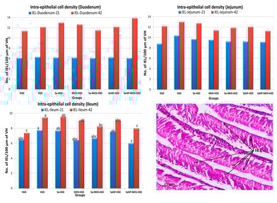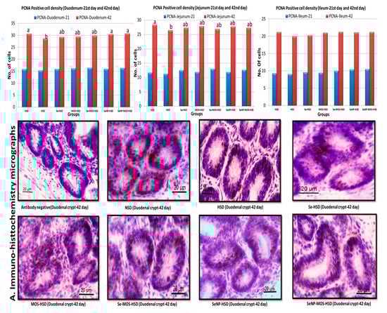 Graphs comparing the intra-epithelial lymphocyte (IEL) density in the segments of small intestine on day 21 and day 42 among groups. The bar height shows the number of intra-epithelial lymphocytes (IEL) per 100 µm of the middle portion of villus height in the two-dimensional image. These values represent the means of eight replicates per group (16 birds per group). NSD: normal stocking density, HSD: high stocking density, Se: selenium selenite, MOS: mannan oligosaccharide, SeNP: selenium nanoparticles. PCNA: proliferating cell nuclear antigen bar of the same color with different letters differs significantly between groups. The micrograph in the right lower corner shows arrowed IELs. (H–E stained, 40×).