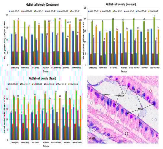 Graphs comparing the goblet cells density in the segments of small intestine on day 21 and day 42 among groups. The data bar height shows the number of goblet cells per 100 µm of the middle portion of villus height in the two-dimensional image. These values represent the means of eight replicates per group (16 birds per group). NSD: normal stocking density, HSD: high stocking density, Se: selenium selenite, MOS: mannan oligosaccharide, SeNP: selenium nanoparticles. GCs: goblet cells. Bars of the same color with different letters differ significantly between groups. The micrograph in the right lower corner shows the AGCs (acidic goblet cells) and MGCs (mixed goblet cells). (PAS-AB stained, 40×).