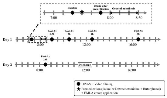 Real-time sedation assessment was performed by one male observer (RW) who was unaware of the treatment group using a dynamic interactive visual analog scale (DIVAS) at the baseline, 20 min after sedation and before the IV catheterization, and at 0.5, 2, 4, 8 and 24 h after the end of the anesthesia. Briefly, the DIVAS was scored on a 100 mm line where the score 0 was considered as no sedation and the score 100 was considered as the deepest possible sedation (e.g., lateral recumbency with no reaction to external stimulation) [15].