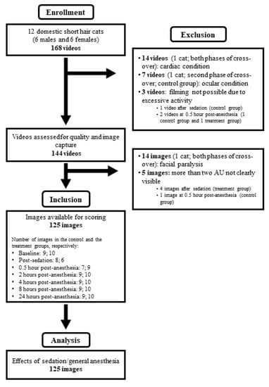 Flowchart of images captured from 12 cats involved in the study of the effects of sedation and general anesthesia on the Feline Grimace Scale© scores. AU: action unit.