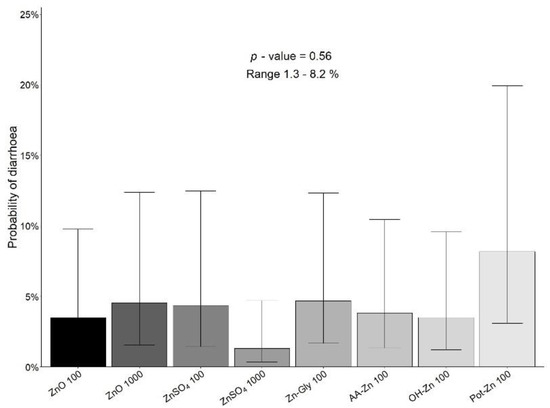 The probability of diarrhoea in pigs receiving different sources and levels of added Zn in their diet from d 0–21 post-weaning. n = 11–12/treatment.