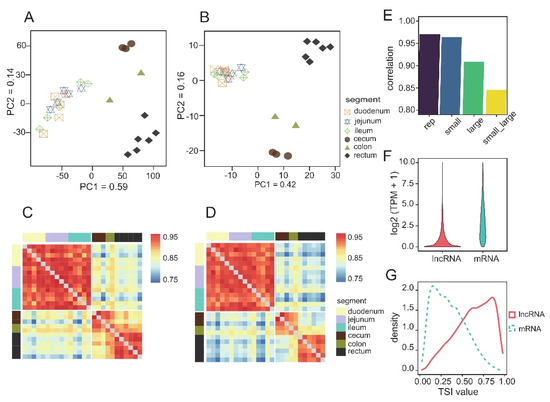 Transcriptome comparison of different intestinal segments. (A) PCA of PCGs and (B) lncRNAs. The proportion of the variance explained by the principal components (PCs) is indicated in parentheses; (C) Heat map showed the correlation of PCGs and (D) LncRNAs expression profiles among samples; (E) Mean Pearson correlation coefficients within different groups; (F) Expression level of PCGs and lncRNAs, TPM value transformed by log2 (TPM + 1); (G) Distribution curves of TSI values of PCGs and lncRNAs.