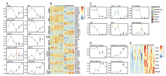 Although different intestinal segments can exhibit similar immune functions, the composition and activity of immune cells still show regionalization [3]. DEG enrichment data suggest that there are differences in leukocyte differentiation between the large intestine and the small intestine (regulation of leukocyte proliferation, GO: 0070663, p = 7.28 × 10−8), so we focused on the composition of intestinal immune cells. Cell composition analysis of samples was conducted using xCell [24]. The enrichment scores for lymphocyte cells (CD8+ T cells and Th1 cells) and non-lymphoid innate immune cells (eosinophils, pDCs, and natural killer (NK) T cells) in the small intestine were higher than those in the large intestine, and macrophages showed high scores in the cecum (Figure 3C) [3]. Microorganisms are an important factor affecting the regional specialization of the intestinal immune system. We investigated the expression patterns of microbial-related gene sets, including the response to bacteria and fungi, the pattern recognition receptor (PRR) signaling pathway, and mucus secretion (Figure 3C). The genes related to bacterial response are highly expressed in the small intestine, while the genes related to fungal response are mainly expressed in the large intestine, which may indicate that the intestinal segment has different defense capabilities against different microorganisms (Figure 3D) [28]. The pattern-recognition receptor (PRR) signaling pathway genes are highly expressed in the large intestine, including Toll-like receptors (TLRs), NOD-like receptors, and MyD88 (Figure 3D). The mucus layer is an important barrier within the large intestine. Genes involved in mucus secretion are highly expressed in the colon and rectum but not in the cecum.