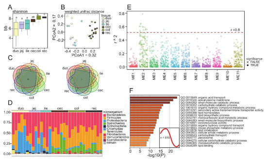 Microorganisms of different intestinal segments (A) Alpha diversity analysis based on the faith PD index; (B) PcoA analysis based on weighted Unifrac distance; (C) Venn diagrams show the distribution of the bacteria in different intestinal segments, and the top 10 most abundant microbes are shown; (D) Microbial composition of different intestinal segments at phylum level; (E) Manhattan diagram shows the correlation between microorganism and modules, and p < 0.01 is regarded as significant correlation. (F) Expression trend and functional enrichment results of modules 2. Duo: Duodenum; Jej: jejunum; Ile: ileum; Cec: cecum; Col: colon; Rec: rectum.