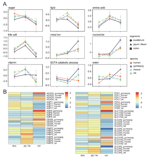 Gene expression differences in intestinal between species (A) Expression trend of fun-tional gene sets and (B) individual genes in different species. Duo: Duodenum; Jej/Ile: jejunum or ileum; Col: colon.