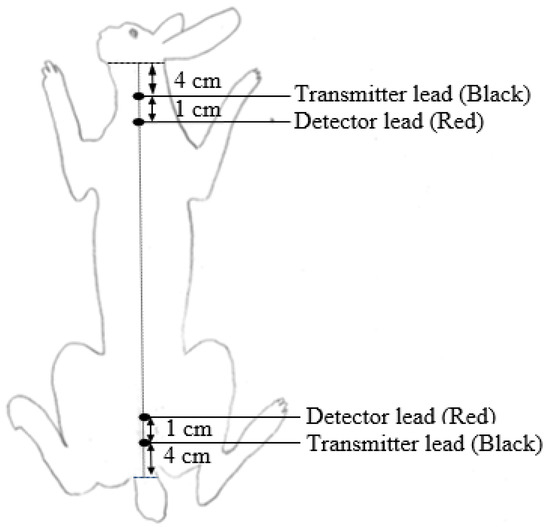 Bioelectrical impedance was measured at different ages (suckling rabbits at 25 and 35 d, and growing rabbits at 49, 63 and 77 days of age) to cover growing periods and slaughter ages commonly applied in commercial rabbit farms. In order to obtain a representative sample of animals, at each timepoint, rabbits from a wide weight range were selected. At 1100 h, the BW and feed intake of animals were registered, and a four-terminal body-composition analyzer (Model BIA-101; RJL Systems, Detroit, MI, USA) was used to register resistance (Rs, Ω) and reactance (Xc, Ω) values. Animals were placed on a non-slip and plain surface (wood or polystyrene) located above the cages to allow animals to be quiet and calm. Then, each pair of electrodes (1 black and 1 red) was inserted subcutaneously using a disposable needle (21 gauge × 1.5″ (0.8 mm × 40 mm)), at 4 cm from the base of the ears and at 4 cm from the base of the tail, respectively, as shown in Figure 1. In each animal, BIA measurement was performed twice (one every half-hour) between 11 and 13 h to determine repeatability. The distance (D) between the internal electrodes (red ones) and the body length (L) of the animals was measured. The impedance (Z) value was calculated as Z = (Rs2 + Xc2)1/2. The volumes (vol1 and vol2) of the animals were calculated as vol1: D2/Rs and vol2: D2/Z in order to determine the relationship between impedance and volume established by Lukaski et al. [27].