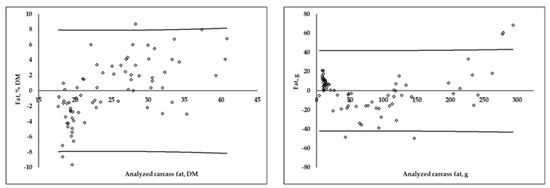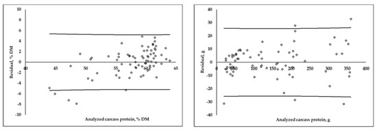 The distribution of the residuals obtained via differences between the analyzed and predicted values using the MLR equations, expressed as a DM percentage and in grams, are shown in Figure 2. For protein and fat, when composition was expressed in grams, the residual distribution was less homogenous at higher content values. In the case of DM percentage equations, when the protein content of a carcass was higher than 60%DM, there was an overestimation in the prediction of protein, and an underestimation when the protein content was lower than 50%DM. On the contrary, when the fat content was higher than 30%DM, there was an underestimation, and below 20%DM, the equation overestimated the carcass fat content.