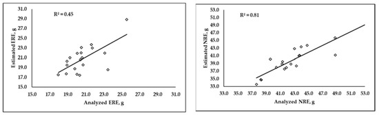 Values of R2 around 0.45 and 0.81 for ERE and NRE, respectively, were obtained when the overall analyzed and predicted retention efficiency values were plotted and compared (Figure 3).