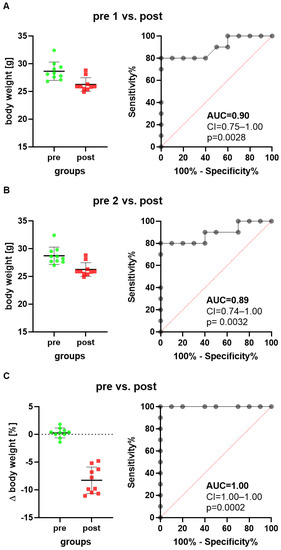 Scatter plots and ROC curves describe changes in body weight of mice when implanting a telemetric transmitter. The ROC curves are generated by plotting sensitivity (true positive rate) versus 1-specificity (false positive rate). The body weight one day after transmitter implantation (post) is compared to the body weight 5 days before transmitter implantation, presented as timepoint pre 1 (A), or to the body weight 2 days before transmitter implantation, presented as time point pre 2 (B). The percentage in body weight change between the two days before transmitter implantation is compared to the percentage in body weight change between the postoperative day and pre 1 (C). The classifier performance of this method in differentiating between animals before and after implanting a transmitter was characterized by the area under the curve (AUC), the confidence interval (CI) and the p value indicating how significant the difference was to the reference line (red dotted line indicating no discriminative power). n = 10 mice.