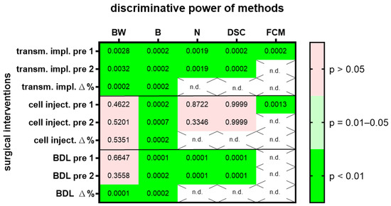 The heat map presents the p-value, which indicates how significant the discriminative power of each method was when differentiating between animals before and after surgical intervention. A laparotomy with transmitter implantation (transm. impl.), cancer cell injection into the pancreas (cell inject.) or bile duct ligation (BDL) was performed. The change in body weight (BW), burrowing activity (B), nesting behavior (N), a distress score (DSC) and fecal corticosterone metabolites (FCMs) was assessed. Animal wellbeing after transmitter implantation was compared to a timepoint, pre 1, or to another time point, pre 2, before implantation with most methods. In addition, the percentage of body weight change and burrowing activity between the two days before transmitter implantation is compared to the percentage in body weight change between the postoperative day and pre 1. The heat map differentiates between no (p > 0.05), a high (p = 0.01–0.05) and a very high (p < 0.01) discriminative power. Data analysis was not done (n.d.) for percent calculations of non-metric data (N, DSC) or for FCMs after BDL, since corticosterone metabolites need a functional bile duct so that it can be assayed in the feces. Transmitter implantation: n = 10 mice. Cell injection: n = 14. BDL: n = 14 for N (n = 7 vehicle-treated and n = 7 MCC950-treated) and n = 16 for BW, B and DSC (n = 9 vehicle-treated and n= 7 MCC950-treated).