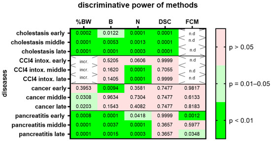Heat map presenting the p-value, which indicates how significant the discriminative power of each method was when differentiating between animals before and at the early middle or late phase of a disease (pooling the data from mice treated with drugs and mice treated with vehicle). The percentage in body weight change (%BW), burrowing activity (B), nesting behavior (N), distress score (DSC) and fecal corticosterone metabolites (FCMs) was assessed. The heat map differentiates between no (p > 0.05), high (p = 0.01–0.05) and very high (p < 0.01) discriminative power. Since corticosterone is metabolized in the liver, no FCMs were analyzed during diseases with liver damage (n.d.). Since mice showed an increase rather than a decrease in % body weight after treatment with CCl4, we did not consider this to be an indication of reduced animal welfare (incr.) and decided not to present the p-value. Mice used for cholestasis: n = 14 for N (n = 7 vehicle-treated and n = 7 MCC950-treated), n = 16 for %BW, B and DSC (n = 9 vehicle-treated and n = 7 MCC950-treated). Mice used for CCl4 intoxification: n = 12 for N (n = 6 vehicle-treated and n = 6 MCC950-treated), n = 10 for %BW, B and DSC. (n = 3 vehicle-treated and n = 7 MCC950-treated). Mice used for pancreatic cancer: n = 14 for %BW, B, N, DSC and FCM (n = 7 vehicle-treated and n = 7 CHC and Met treated). Mice used for chronic pancreatitis: n = 16 for %BW, B, N, DSC and FCM (n = 8 vehicle-treated and n = 8 miRNA21 inhibitor treated).