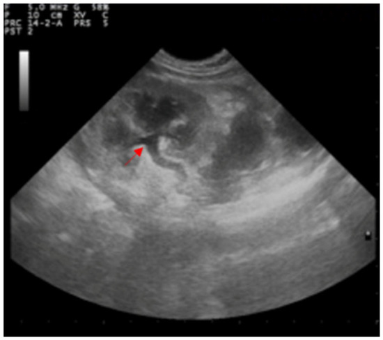 Ultrasound examination of the left kidney showing the dilatation of the renal pelvis and ureter (red arrow).